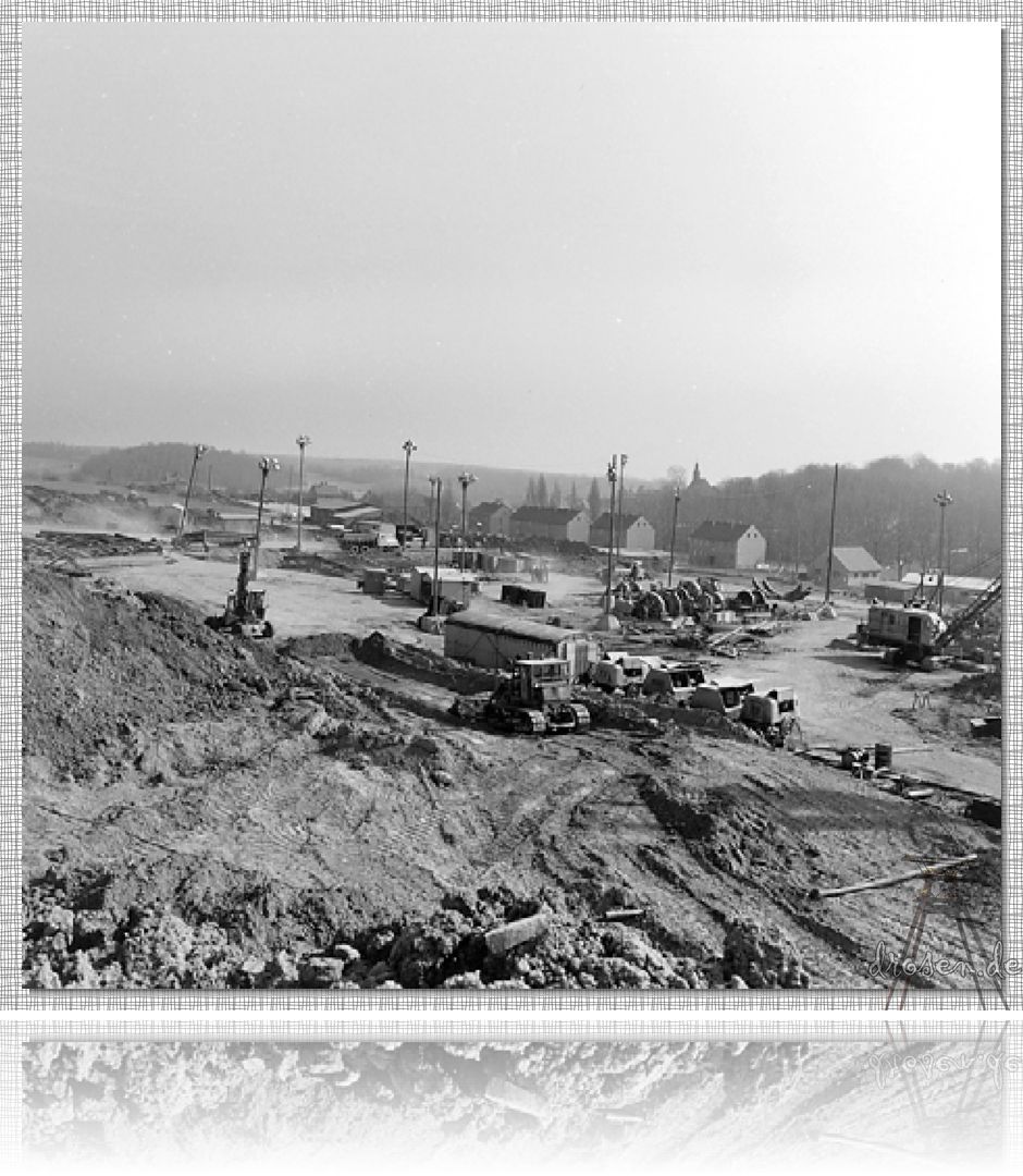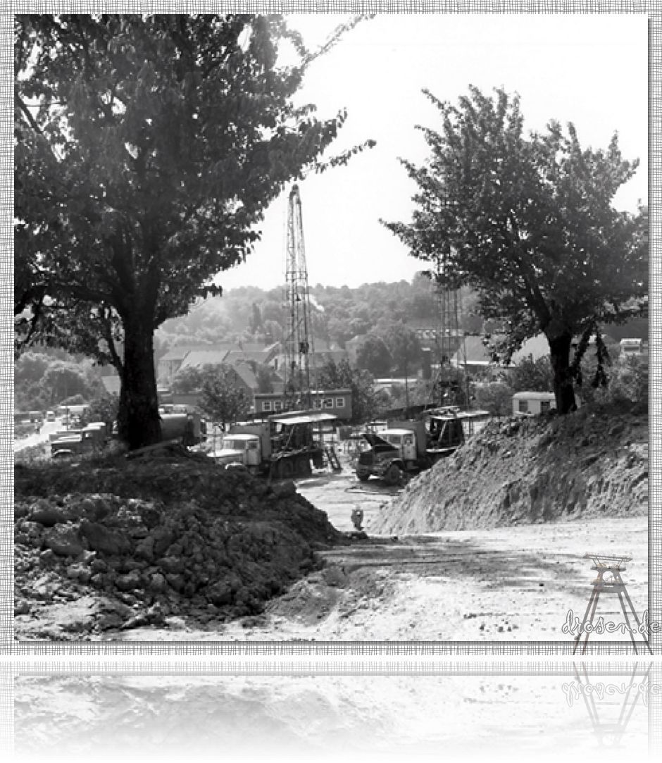 Für den Aufschluß der Betriebsfläche des Bergbaubetriebes Drosen wurde die Infrastruktur an den seit 1974 vorhandenen Bergbaubetrieb Beerwalde angeschlossen. Dazu gehörten die 3 km lange Betriebsstraße, Rohrleitungen für die Trink- und Brauchwasserversorgung, Leitungen für Druckluft, Elektroenergie und die Trasse der Werksbahn (Anschlußbahn) für den Antransport des Materials, für den Personentransport und für den Erztransport. Das Teufen der Schächte begann im Dezember 1975 mit dem Schacht 415 durch den Schachtbaubetrieb der SDAG Wismut (Bild 2, 3, 4).