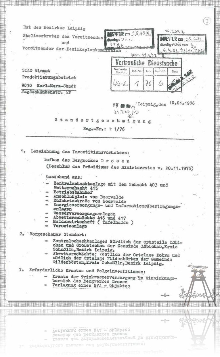 Standortgenehmigung des Rates des Bezirkes Leipzig [2]. Als Bestandteile des neuen Bergwerkes wurden genannt: