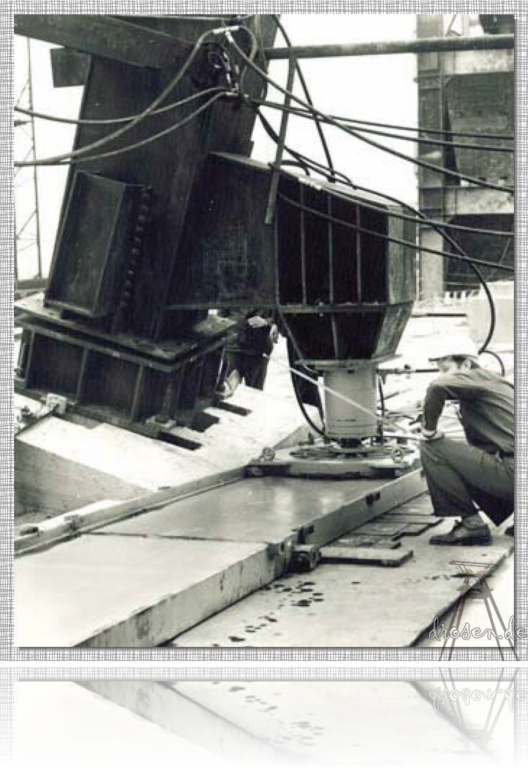 mittels Fluidkissentechnik (Bild 13) auf 2 Bahnen, der Turm des Schachtes 415 (4.700 Tonnen)