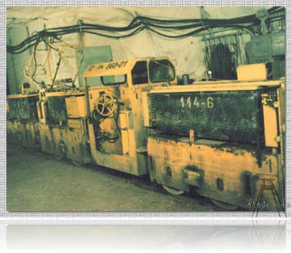 Während der Aufnahme der Abbauarbeiten im BB Drosen (1982) war in der Ronneburger Lagerstätte der Übergang zum Abbauverfahren Abwärtsgeführter Teilsohlenbau mit selbsthärtenden Versatz (TmV) erfolgreich vollzogen. In Drosen wurde den geologischen Gegebenheiten entsprechend ca. 60 % des Erzes aus Lederschiefer- (Og3) und ca. 40 % Diabas- Erzkörpern (ß) gewonnen. Als Gewinnungsverfahren kam ausschließlich die Bohr- und Sprengarbeit zur Anwendung. Die Abbauarbeiten entsprachen denen in den übrigen Thüringer Bergbaubetrieben. Dieselgetriebene Fördergeräte kamen nicht zum Einsatz, dafür aber Elektrolader (Fahrschaufellader ULE-2), deren Aktionsradius durch eine Drehstromoberleitung erweitert wurde (Bild 25).